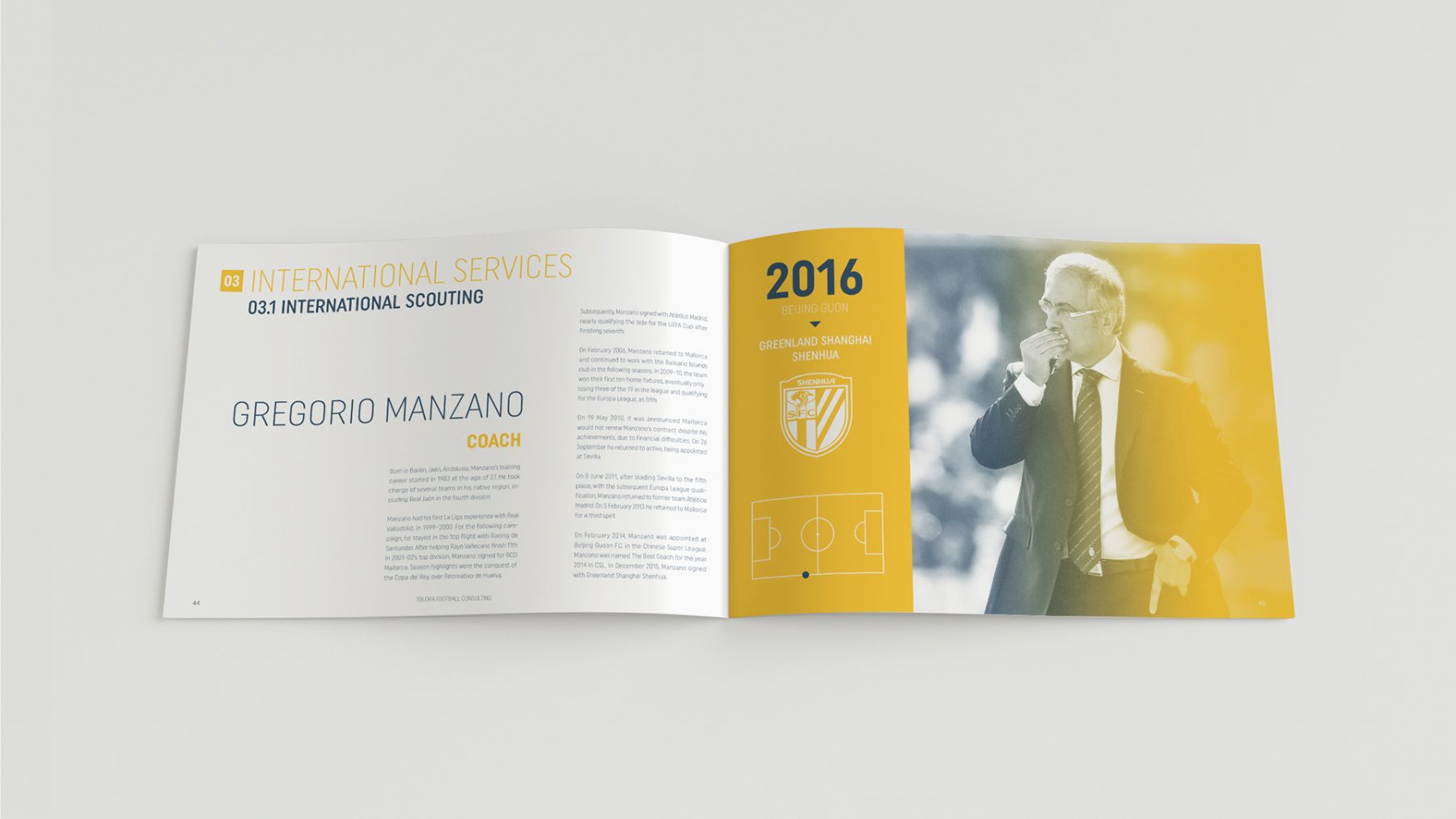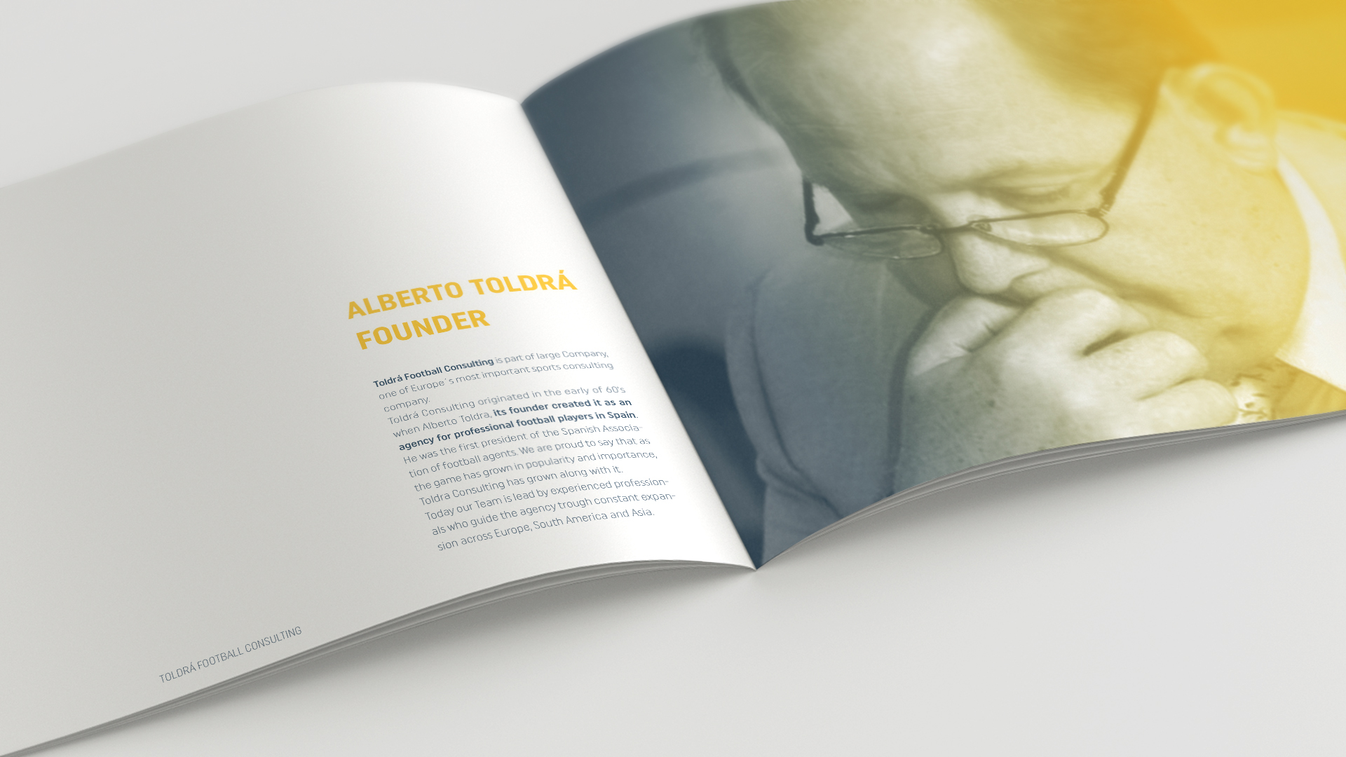Cliente. TOLDRÁ Actividad. FootBall Consulting. Necesidades Comunicación. Proyecto Diseño gráfico de la imagen corporativa Toldrá y desarrollo de un catálogo de empresa en el cual se informa de la trayectoria y servicios que ofrecen.